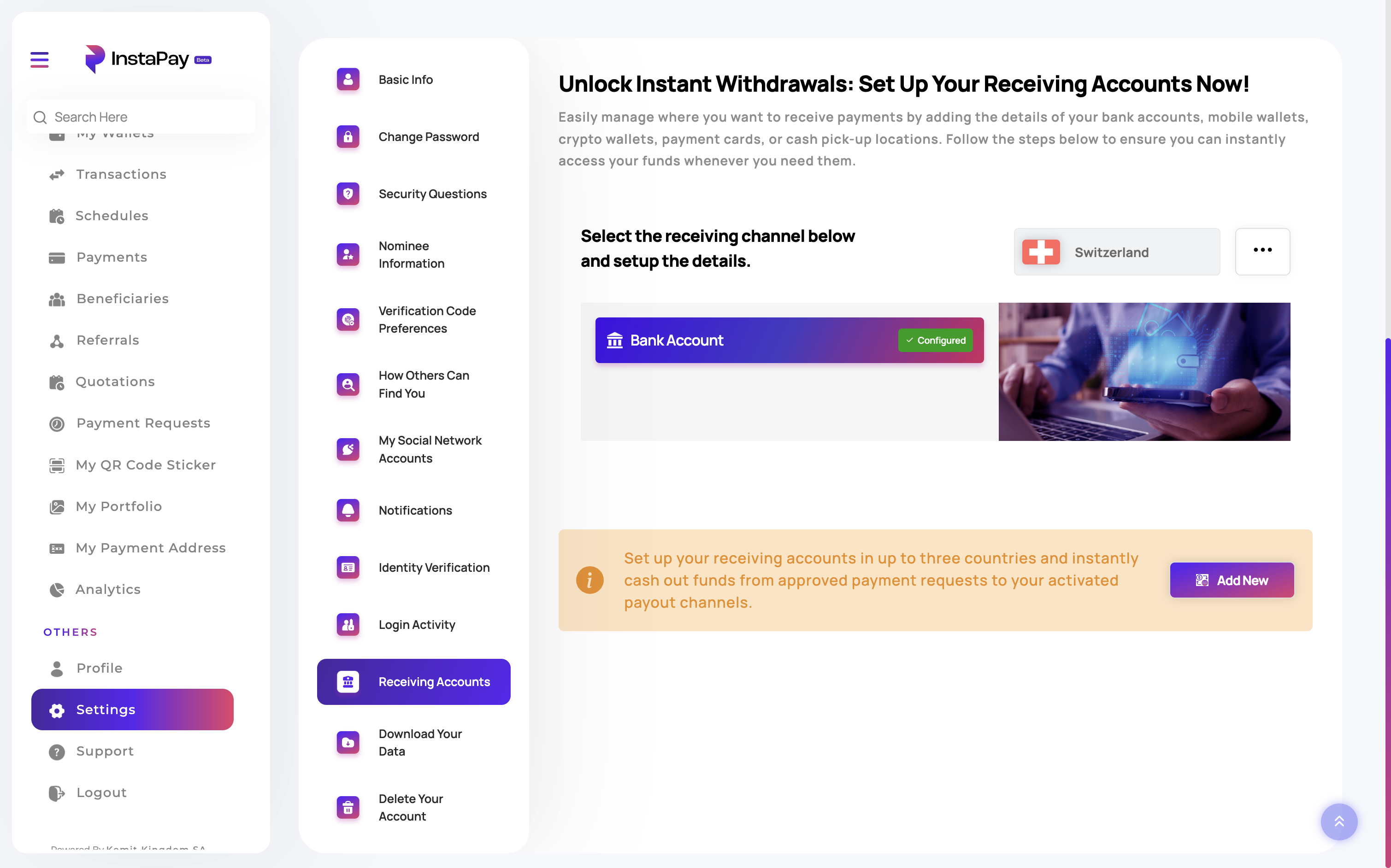 أضف قنوات الدفع المفضلة لديك، مثل الحسابات البنكية، والمحافظ الإلكترونية، أو بطاقات الدفع، لسحب الأموال من محفظة إنستا باي الخاصة بك.