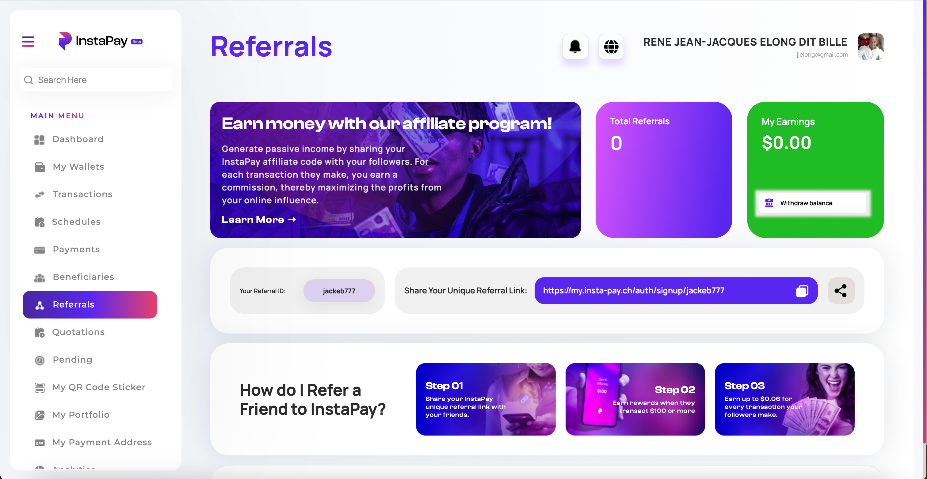 مع برنامج إحالة إنستا باي، يمكنك كسب دخل غير نشط كلما قام متابعوك أو أعضاء مجتمعك بإجراء تحويلات دولية. شارك رابط الإحالة الفريد الخاص بك على منصات التواصل الاجتماعي، وكلما قام أحد المستخدمين الذين قمت بإحالتهم بإجراء معاملة، ستحصل على عمولة من رسوم المعاملة. كلما نما مجتمعك، زادت أرباحك. تتبع أرباحك، واحصل على تحليلات مفصلة، وسحب مكافآتك على الفور أو في نفس اليوم إلى الحساب الذي قمت بتحديده.