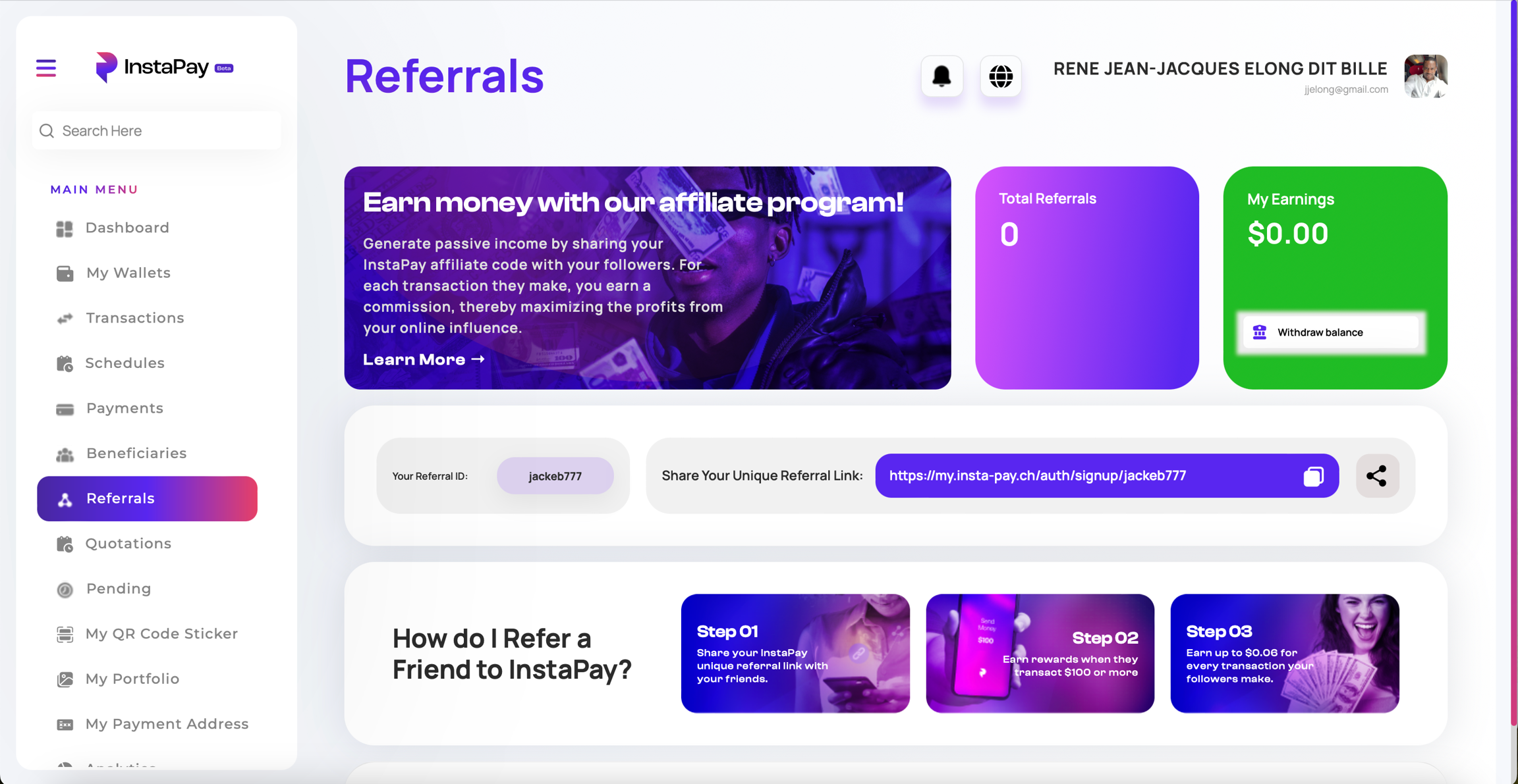 通过即时支付的推荐计划,您可以在关注者或社区成员进行国际转账时赚取被动收入。在您的社交媒体平台上分享您独特的推荐链接,每当您的推荐用户进行交易时,您都会获得交易费用的佣金。您的社区越大,您赚取的收入就越多。跟踪您的收入,访问详细分析,并将您的奖励立即或当天提取到您设置的接收账户中。