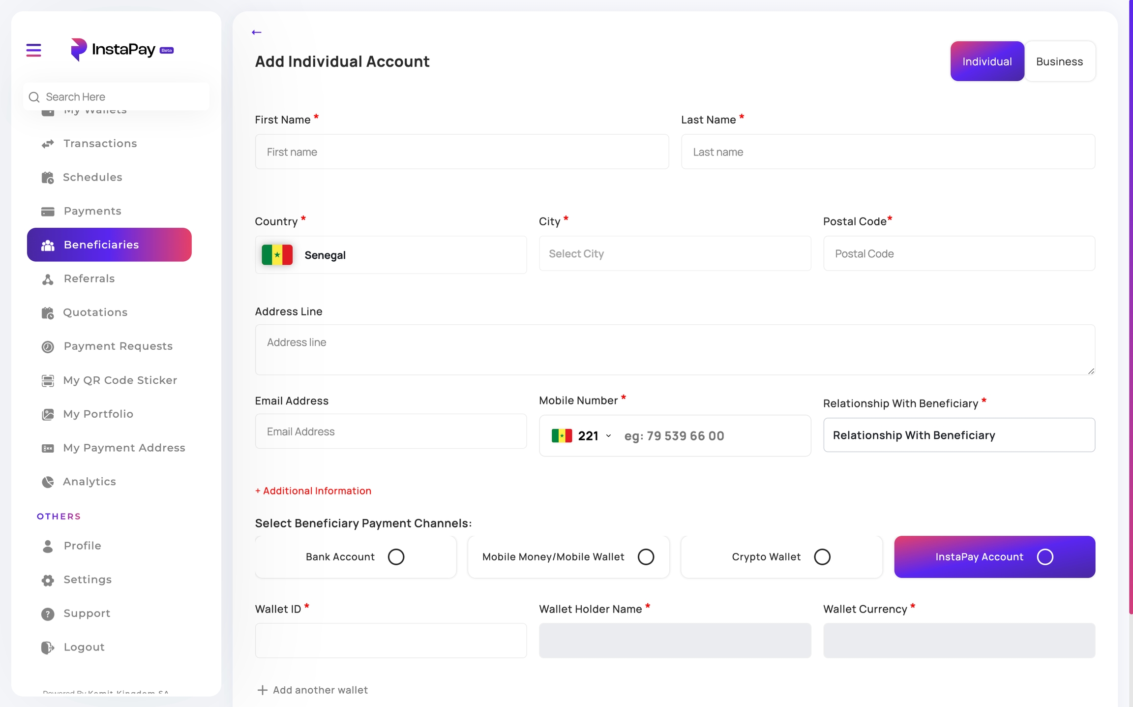 ID portfela: Wprowadź identyfikator portfela InstaPay odbiorcy, aby dokonać bezpośrednich przelewów w ramach platformy InstaPay.